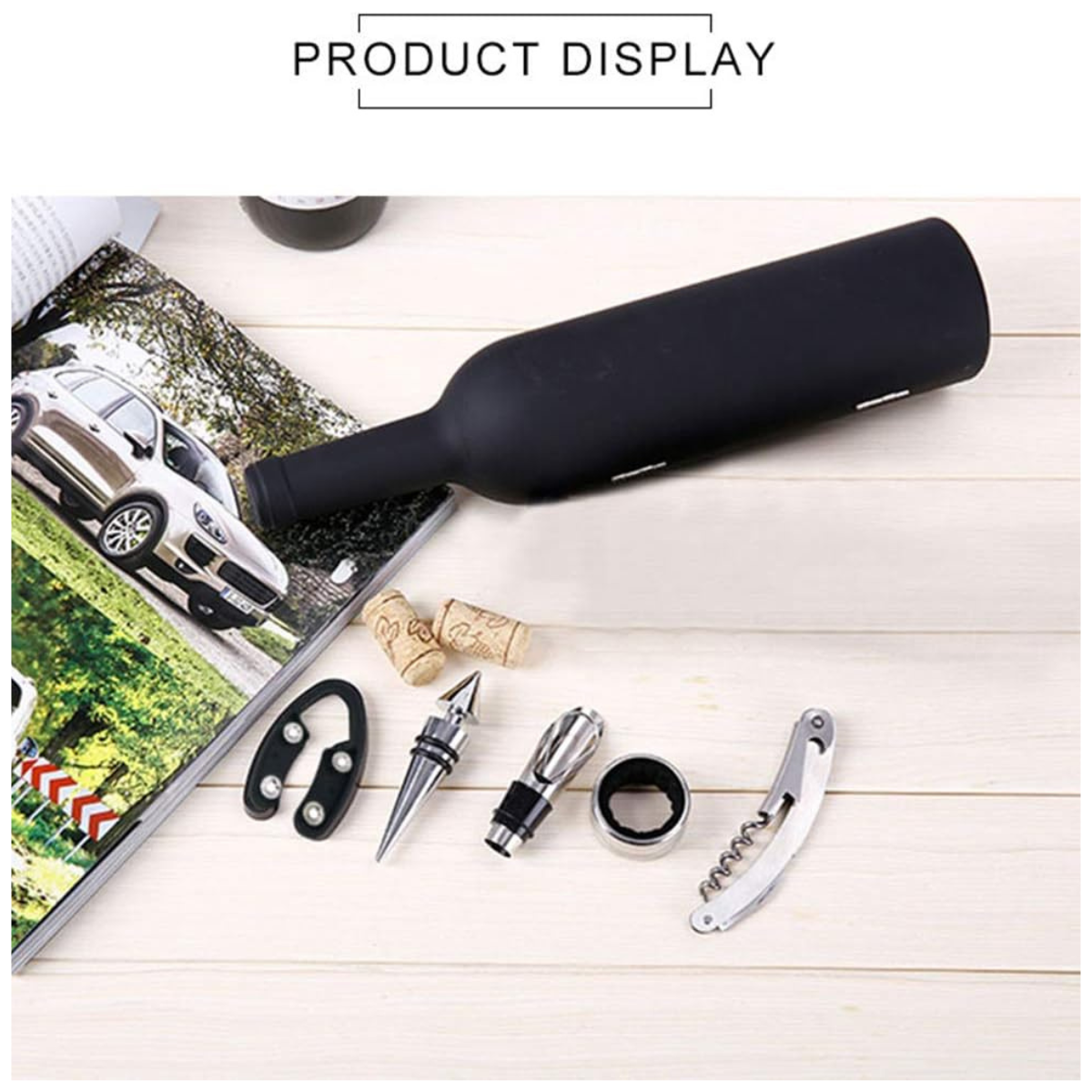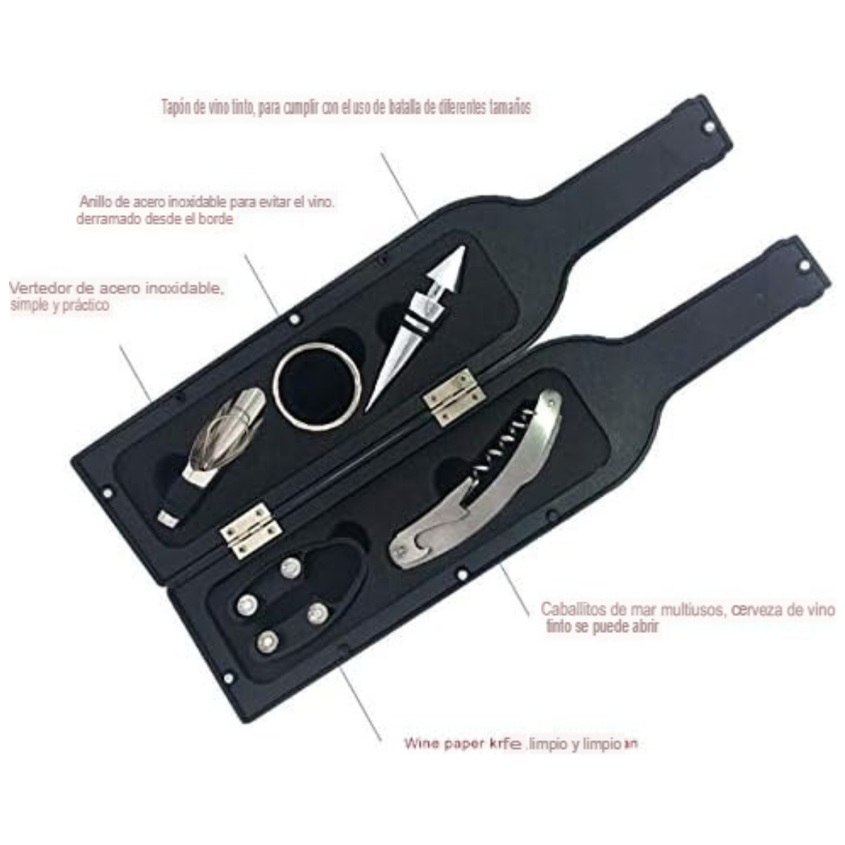 Sorprende esta Navidad con un detalle elegante y funcional. Este exclusivo estuche en forma de botella guarda cinco herramientas esenciales para servir vino, licores o whisky con estilo: sacacorchos de camarero, aro antigoteo, dosificador, tapón y abridor adicional.